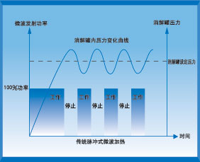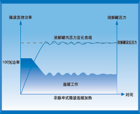 微波功率自动变频控制技术是先进的微波制样控制技术。它通过感应消解罐中压力和温度的变化自动地改变微波发射的功率,实现压力/温度和功率的无级闭环控制和非脉冲式微波连续加热。这一技术能够大大提高多罐样品消解的均匀性和压力/温度控制的精度。传统的微波消解技术是脉冲式加热,通过微波发射的开/关来控制消解罐中的压力和温度,即使有的微波消解仪可以人工改变功率(分几档功率),其微波的发射还是开/关脉冲式的,只是发射的全功率通过人工调节分成几档。而非脉冲式微波加热无需人工调节,通过变频技术自动随着消解罐内压力/温度的变化调整微波发射的功率。在消解加热的过程中,消解罐内的压力/温度上升,微波功率就下降;压力/温度下降,功率就上升,从而达到一个动态的平衡。从下边的比较图中可以看到,传统脉冲式微波加热时,消解罐内压力变化的幅度较大,压力控制的效果较差;而采用非脉冲式微波连续加热,由于受压力和微波发射功率的闭环控制,消解罐内压力基本固定在所设定的压力上,压力控制的效果和精度都大大提高。样品消解的安全性也随之提高。 温度控制若采用这一技术其效果同压力一样,不会出现温度上冲或大幅震荡的现象,所以样品消解的安全性和萃取/合成的产率都将明显提高。