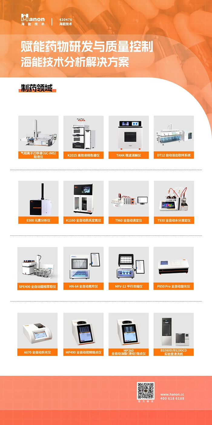 制药是海能技术重要的产品应用领域,海能、新仪、悟空、G.A.S.、海森、白小白为用户提供可靠的仪器和方法支持。