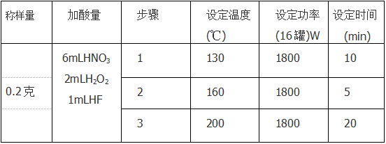 (1)在0.2g试样中加入6 mL硝酸、2 mL过氧化氢及1 mL氢氟酸进行程序升温微波消解,可以得到澄清、透明的消解液。