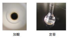 实验结束,冷却后取出,转移至通风橱中打开消解罐,赶酸定容后,消解液澄清透明。