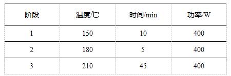 称取剪碎的环氧垫片样品约0.1g(精确至0.1mg),加入1mL硫酸,将消解罐放置在赶酸器上120℃预处理30min,取下冷却后补加8mL硝酸和1mL氢氟酸,静置10min左右,待无明显反应后,组装消解罐,按照如下设置参数进行实验: