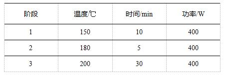 称取二氧化钛样品约0.1g(精确至0.1mg),加入2mL硝酸、6mL盐酸和3mL氢氟酸,静置15min左右,待无明显反应后,组装消解罐,按照如下设置参数进行实验:
