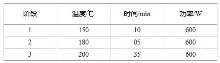 使用硝酸作为实验的消解试剂,称取瓦楞纸样品0.4g(精确至0.1mg)于消解罐中,加入10mL硝酸,静置5min左右,组装消解罐,按照如下设置参数进行实验: